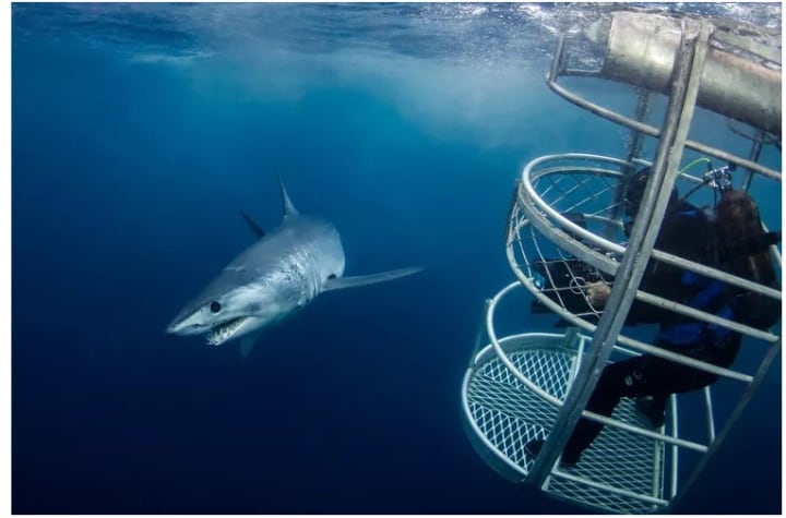 Humans aren't on the menu, of course. Companies like Calypso Star Charters keep you safe inside a steel cage or what's known as an "aqua sub" (essentially a reverse aquarium, where the fish are outside the glass). You'll be free to marvel at these 19-foot-long beasts as they swim within arm's reach.