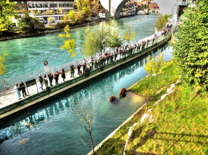 The delightful Bear Park is located in Bern, the capital of Switzerland. This park is home to three bears like in the children's story. They are Finn, Bjork, and their daughter Ursina.