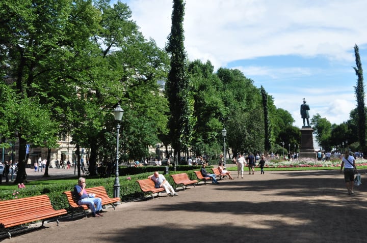 In Helsinki, the capital of Finland a popular park is Esplanade Park or Espa. People enjoy taking walks here, watching performances, and enjoying picnics. There are lovely tree-lined alleys and colorful flowerbeds.