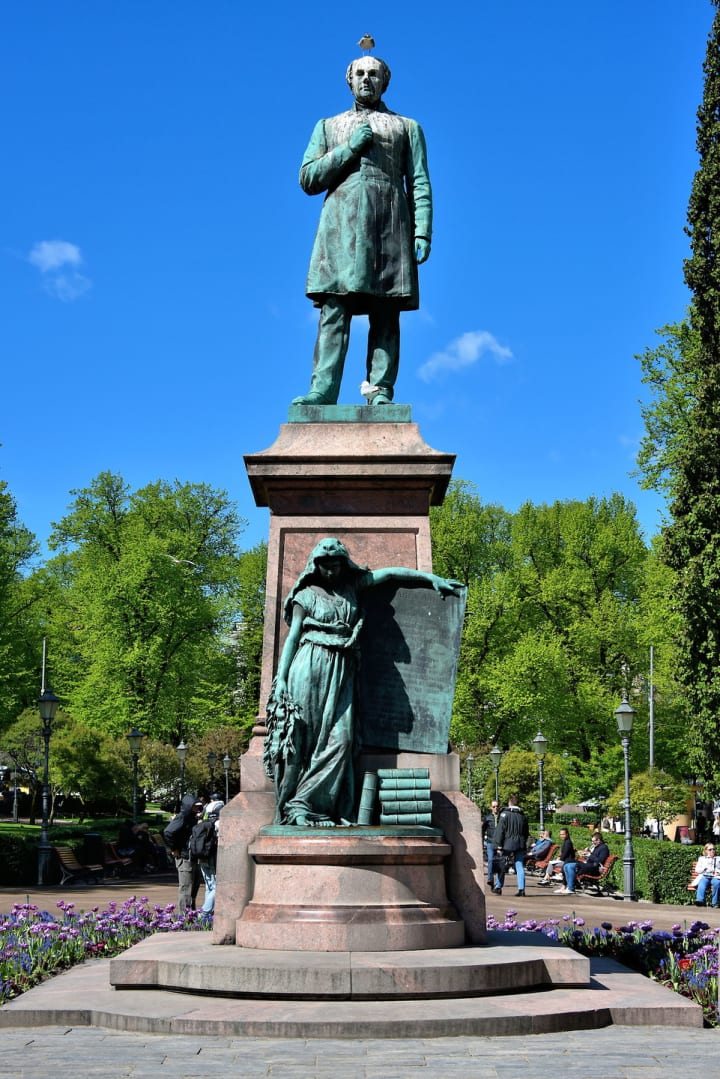 The Maiden of Finland wrapped in a bearskin is on the pedestal of this memorial. In her right hand is a laurel wreath and a pile of Runeberg’s books lie by her feet. In her left hand, she holds a tablet with the words of the first and last two stanzas of the Finnish national anthem in Swedish. The inscription on the side of the memorial reads “From the Finnish people to the Singer of Our Nation”.