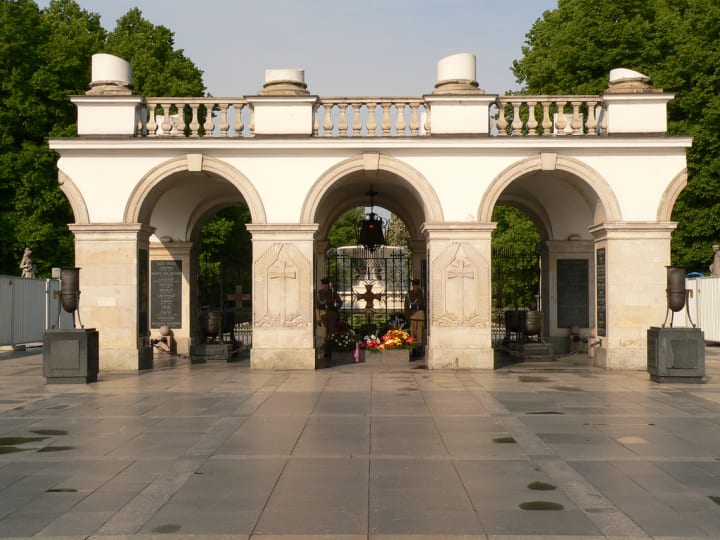 Behind the tomb, there is a beautiful fountain that was designed by Henryk Marconi in 1855. Around the perimeter of the fountain as well as at the four cardinal directions -North, South, East, and West stand statues dedicated to the historical elements of Warsaw.