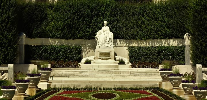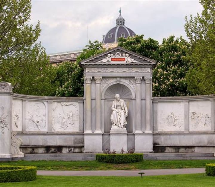 The statue of the Austrian poet and playwright Franz Grillparzer is flanked by reliefs that depict scenes from his plays.