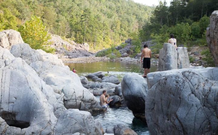South of St. Louis, Missouri in the Ozark Mountains is Johnson’s Shut-Ins where a river is slowed or blocked by boulders or other rock formations. Here you’ll see a maze of whitewater chutes and small pools that formed when ancient volcanic rock blocked the east fork of the Black River. The swimming holes have natural water slides.