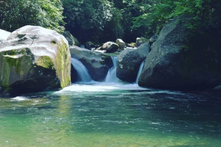 In the Great Smoky Mountains National Park in the state of North Carolina the Big Creek Trail will take you to an emerald pool that is hidden by a canopy of trees and surrounded by large boulders. This is the Midnight Hole which is at the bottom of a 6-foot-high waterfall. People enjoy swimming and plunging into the pool from the rocks in the water.