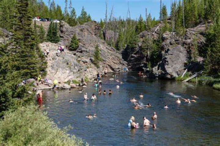 Firehole Canyon offers a great swimming hole in the state of Wyoming in Yellowstone National Park. The canyon is located near the west entrance to the park. The rapids of the Firehole River empty into a deep pool creating a wonderful swimming hole that is surrounded by rocks. There are also shallow areas for kids to wade and splash in and a beach to relax on.