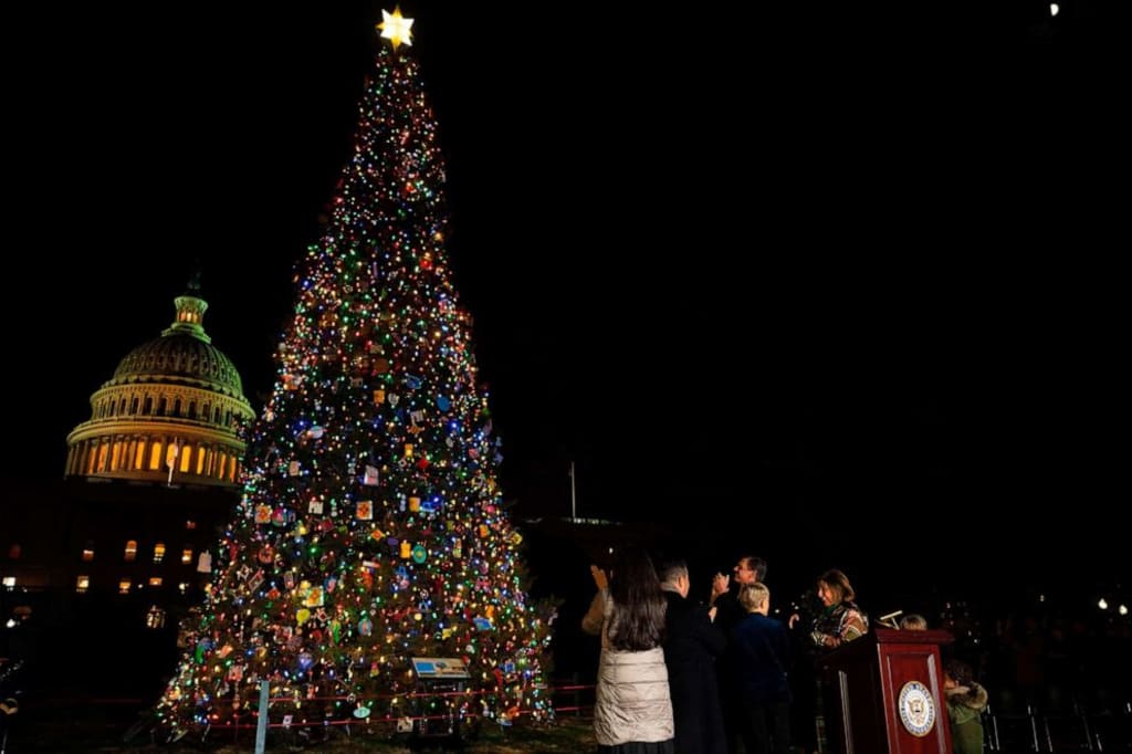 The Christmas tree on Capitol Hill comes from the Humboldt-Toiyabe National Forest in Nevada. (pictured above) The lighting of the holiday tree is a time-honored tradition and takes place during a ceremony on the West Front Lawn on December 2, and then the tree is lit from dusk till 11 PM every evening through early January. Members of the US Coast Guard Band performed during the US Capitol Christmas Tree lighting ceremony on the West Front Lawn at the US Capitol on Dec. 2, 2025, in Washington, DC.