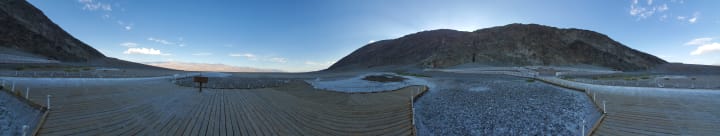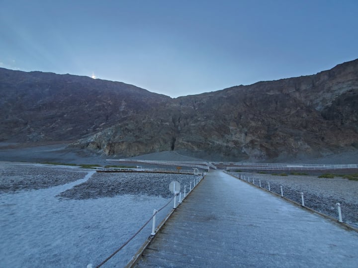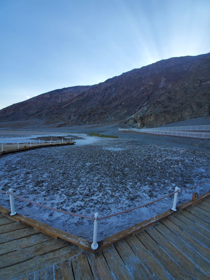 Salt crystals form as well as calcite, gypsum, and borax. The rain, salt, and crystals form patterns that are visible as visitors walk Badwater Basin. The man-made wooden walkway stops at a sign warning visitors that after 10a.m. due to extreme heat to not walk further. I was visiting at 7a.m. and was able to take a walk onto the salt bed. It felt like a strong rubber but still had give as my feet stepped forward.
