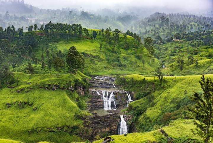 This beautiful waterfall, which is located between Kotagala and Talawakele, is known as the "Little Niagara of Sri Lanka." This fall features two cascading cascades. The tiny one is just 50 m high, while the huge one is 80 m high and 50 m broad. It flows through a tea estate after tumbling down rocky rocks into a large pool.