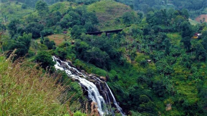 You'll come across another lovely waterfall after crossing the Nanu Oya railway station. Elgin Falls, which is 25 meters tall, is situated on the Elgin tea estate between Nanu Oya and Ambewela. Elgin, a significant town in Moray, Scotland, inspired the name of Elgin Falls. The fall is located at a height of around 1,500 meters. The Ella Odyssey train will stop there for two minutes, allowing you to get some fall-themed photos.