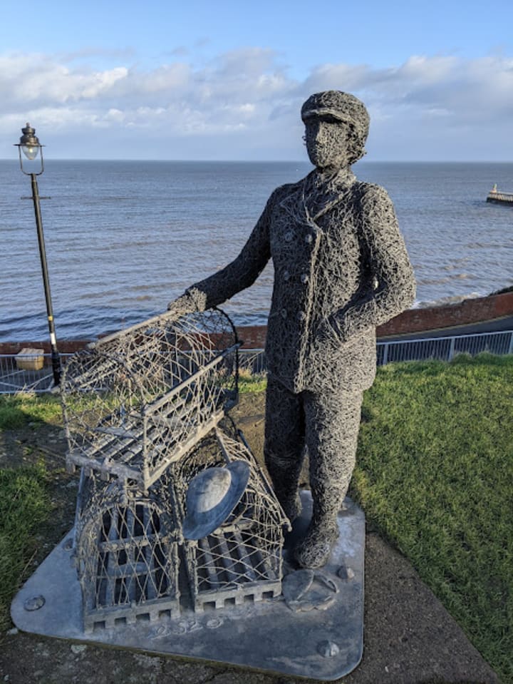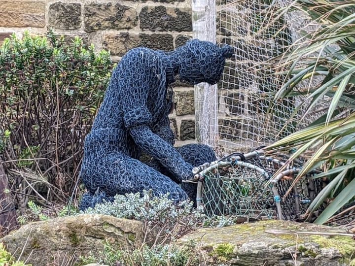 They are the nine Emma Stothard Sculptures, but while I was tracking them down (looking for the Penny Hedge actually) I discovered the similar but ungalvaised sculpture which I have shown above which seems to be someone mending a lobster trap.