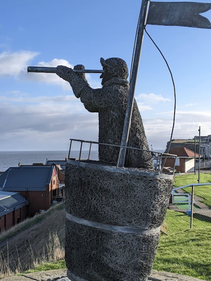 On West Cliff just down the coast from the Crows Nest Lookout, by the Sunken Garden is Dora (1890-1980). She was famous for being noted as the very first female fishing boat skipper on the North East coast. She was also an author who penned her memoirs of nursing in WWI and she also wrote from her perspective about the history of the fishing communities in Whitby and on the North East Coast. Dora also owned and skippered her very own boat.