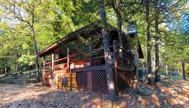 Black Bass Lake has miles of trails leading through the woods and along rock formations. Visitors can stay in luxury log cabins in the woods.