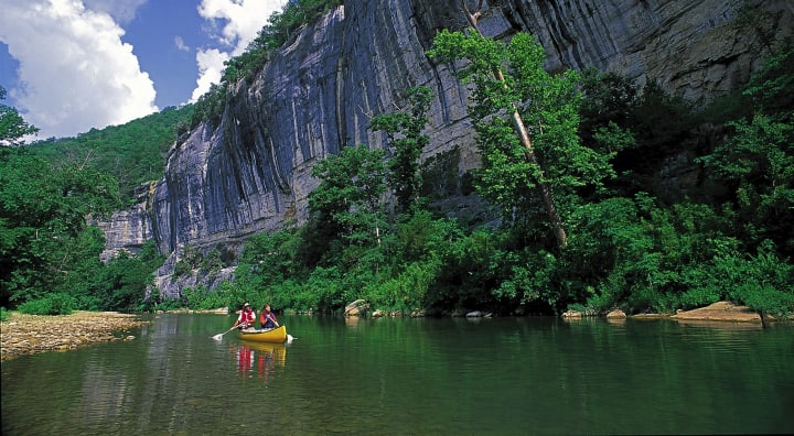 The Buffalo River flows through Arkansas passing huge bluffs, craggy outcrops, and wild state forests. Along the river, you can experience the adventure of wild white rapids and calm ebbing pools. You’ll also find lovely waterfalls. Between Ponca and Kyles Landing, you’ll find a section of the Buffalo River that has been deemed to be the most scenic. This stretch cuts through rough, mountainous terrain. There are sharp rock outcrops, massive bluffs, and lovely foliage.