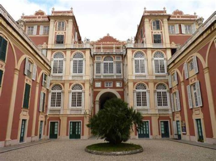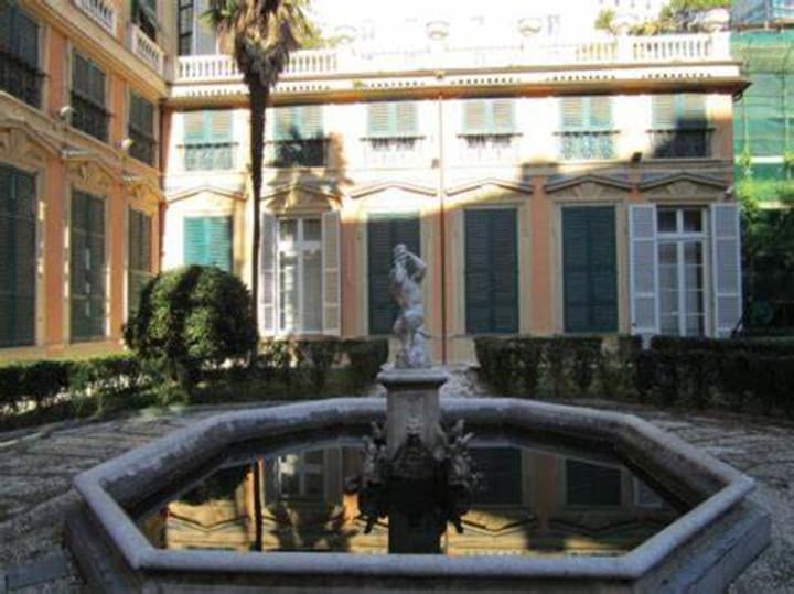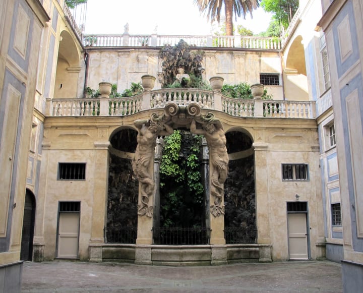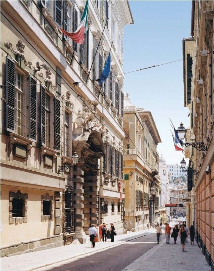 Palazzo Lomellino has a most elaborate facade. The building dates back to 1563 and has a gray-blue exterior with stucco adornments. In the inner courtyard is an 18th-century monument to the nymphs. Upstairs you can see 17th-century frescoes by Bernardo Strozzi. These depict allegories of the New World, in homage to the one-time owners of the palace, the Centurione family, who financed the voyages of Columbus.