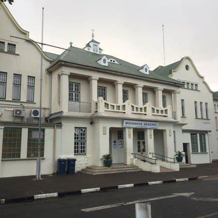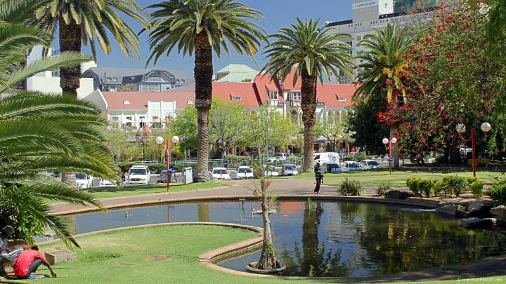 The surrounding gardens were laid out in the 1930s and include an olive grove and a bowling green. In the front is Namibia’s first post-independence monument, a bronze-cast statue of the Herero chief Hosea Kutako.