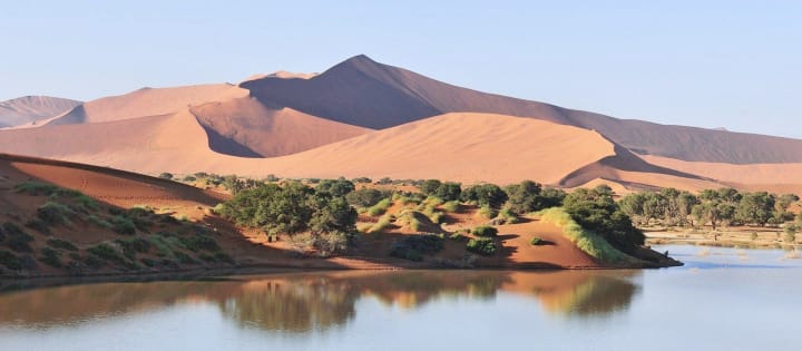Sossusvlei is a salt and clay pan that is surrounded by high red dunes, located in the southern part of the Namib Desert in the Namib-Naukluft National Park. Some of the dunes here are the highest in the world. The colossal mound of Dune 7 rises over 350 meters above sea level. Visitors prefer taking 4 x 4 tours. There are sightings of antelope, oryx, springbok, and ostrich.