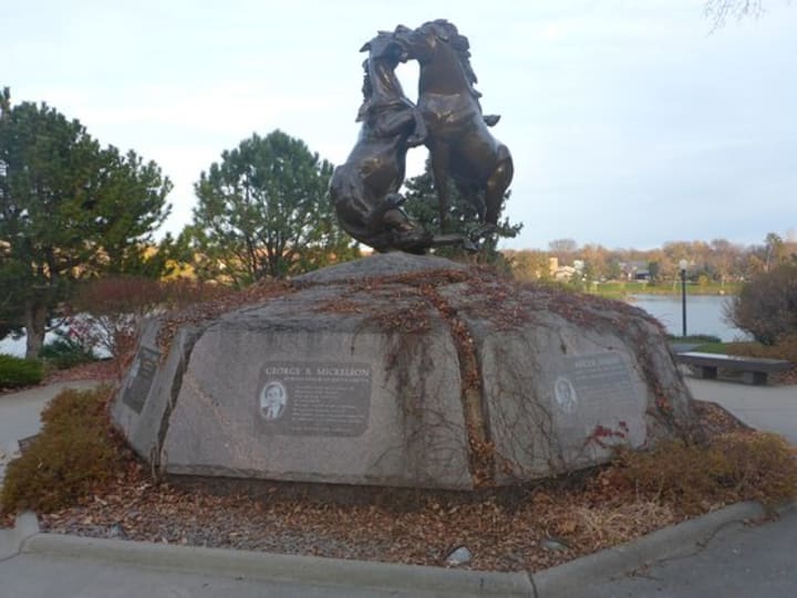 The Fighting Stallion Memorial commemorates the deaths of eight citizens of South Dakota who died in a plane crash on April 19, 1993, while on a state mission. The sculpture is made of bronze and depicts two stallions fighting. The sculpture stands on an artificial hill with eight plaques that honor the fallen heroes.