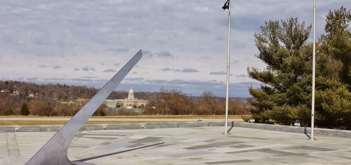 The Kentucky Vietnam Veterans Memorial sits on a hill that overlooks the state capitol building. It was completed in November 1988 and features a huge sundial with a stainless steel gnomon and granite plaza beneath it. Carved into the plaza are the names of 1104 Kentuckians who died in Vietnam.