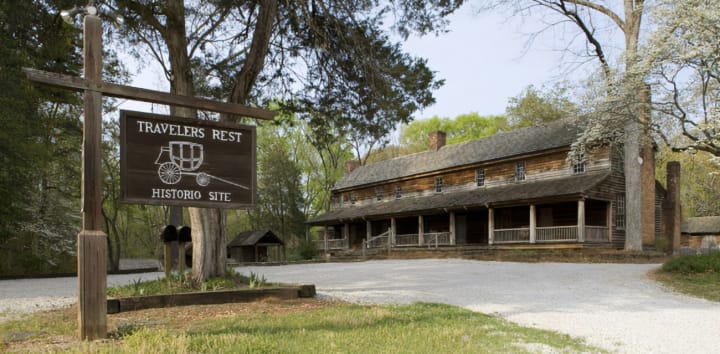 Traveler’s Rest is located east of Toccoa. In the early 1800s, the Tugaloo River Valley was inhabited by the Cherokee Indians. It became a busy crossroads for stagecoach and riverboat travelers. An enterprising local plantation owner Devereaux Jarrett bought a small wayside inn in 1833 and expanded it into a long, rambling structure with eight rooms on the ground floor and five more above. The building housed an inn, a store, a post office. and a home for the Jarrett family. The outbuildings surrounded by white oaks and American holly include slave cabins and a loom house. It was designated as a National Historic Landmark on January 29, 1964.