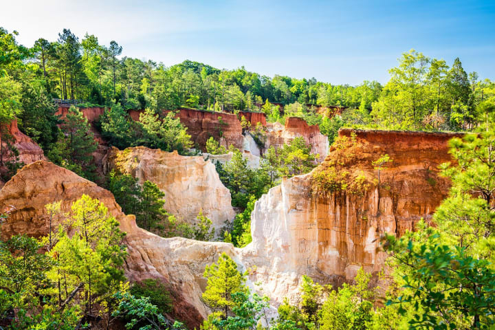 Providence Canyon State Park is a scenic 200-acre canyon area (massive gullies as deep as 150 feet were caused by poor farming practices during the 1800s) which is dominated by the 1,208-acre park. Here wild plants and shrubs grow including the rare Plumleaf Azalea whose flowers range in color from orange to various shades of red. It blooms from July to September. Other indigenous plants include verbena, maypop, wild ginger, and prickly pear.