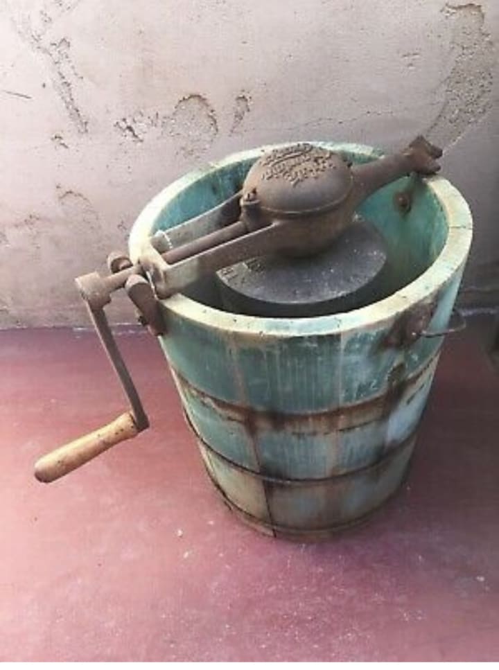 For the record, what’s pictured above is an old fashioned ice cream maker. That particular maker is actually attractive cuz what I saw the neighbor drag out of his tent I wouldn’t keep worms in let alone make food in.