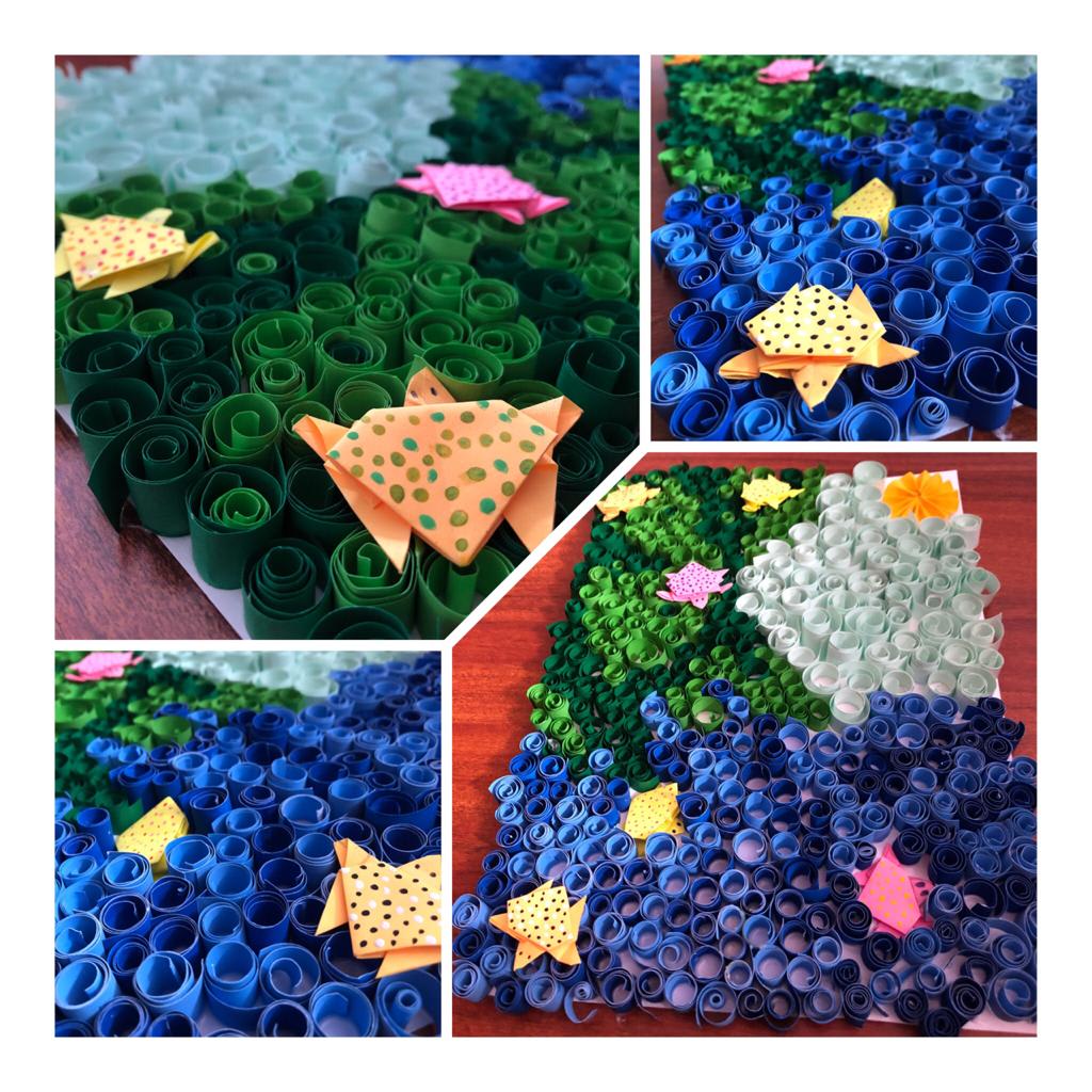 I look at what I've created until now. I'm almost done. I take the mint colored paper and for the last time I cut it in strips and roll it into spirals. I stick it on the top right of what once used to be a white blank page. I start to feel the breeze of the misty air flowing through my wet hair. A few drops of rain water fall on my face but it quickly stops while I look up at the sun. It's brighter than ever as its rays come down through the clouds. I close my eyes and come back. I look down. The blank piece of paper I had started with was taken over completely by the green, blue and mint spirals and six turtles. Some on the green heading towards the water and others already swimming through the blue. I admire my work and I´m satisfied. It's exactly how I remember it…
