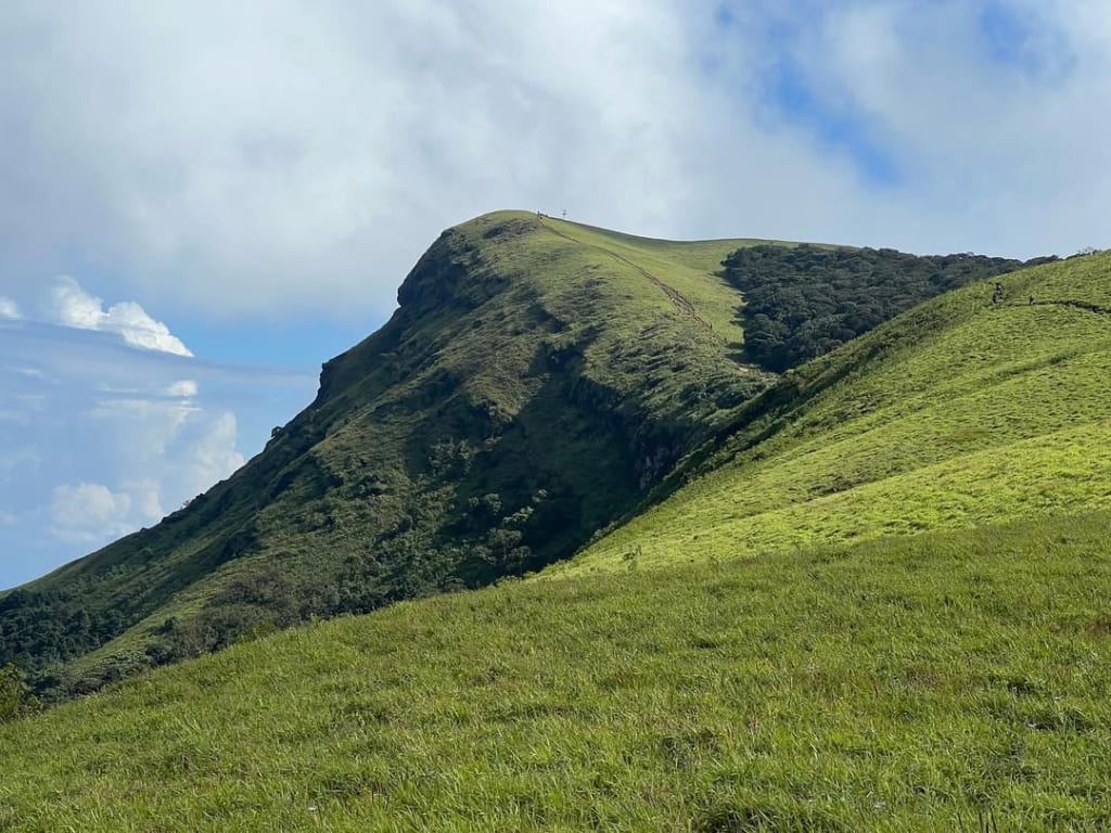 The trek usually starts from Mullodi village, near Kalasa. The first part of the trail takes you through thick forest, where tall trees keep the path cool and shaded. You’ll hear birds, insects, and the sound of water flowing nearby. As you walk further, the forest slowly opens into wide grasslands.