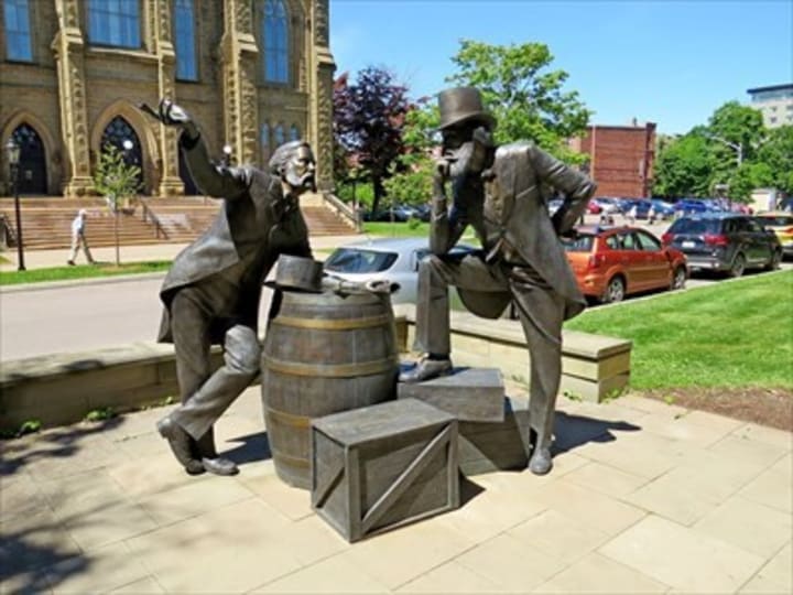 Across from the basilica on Great George Street, you'll find the historical statue of two John Hamilton Grays who attended the Charlottetown Conference in 1964. They were the two Fathers of the Confederation.