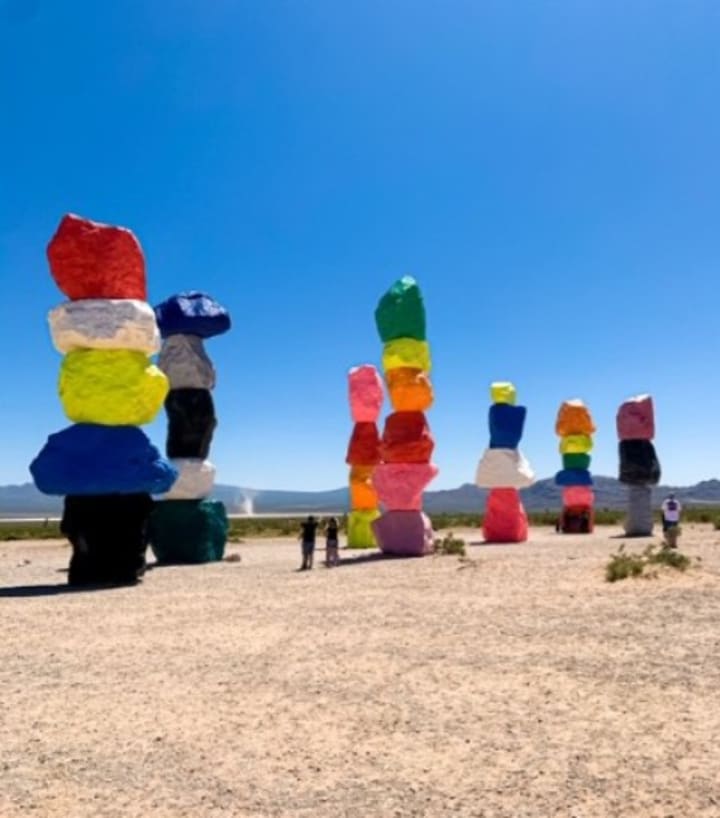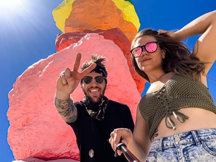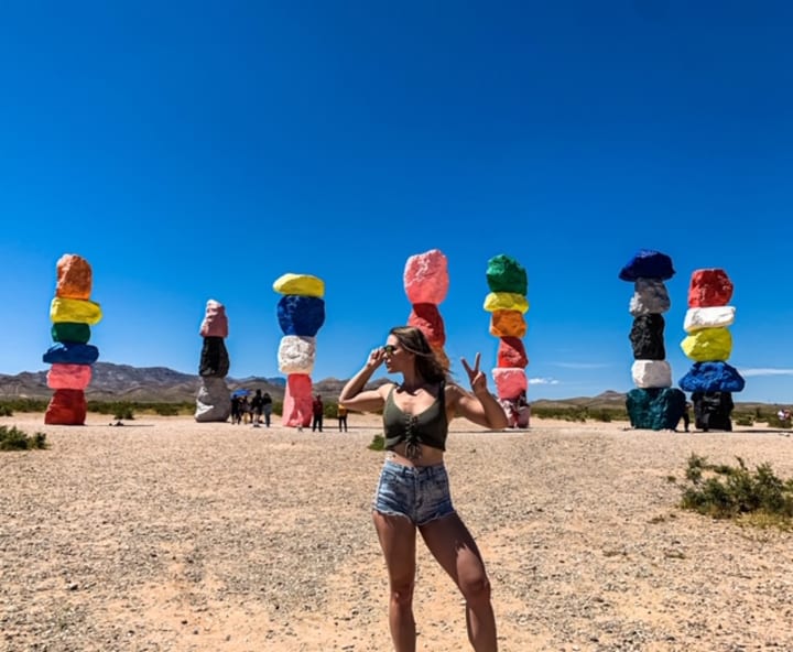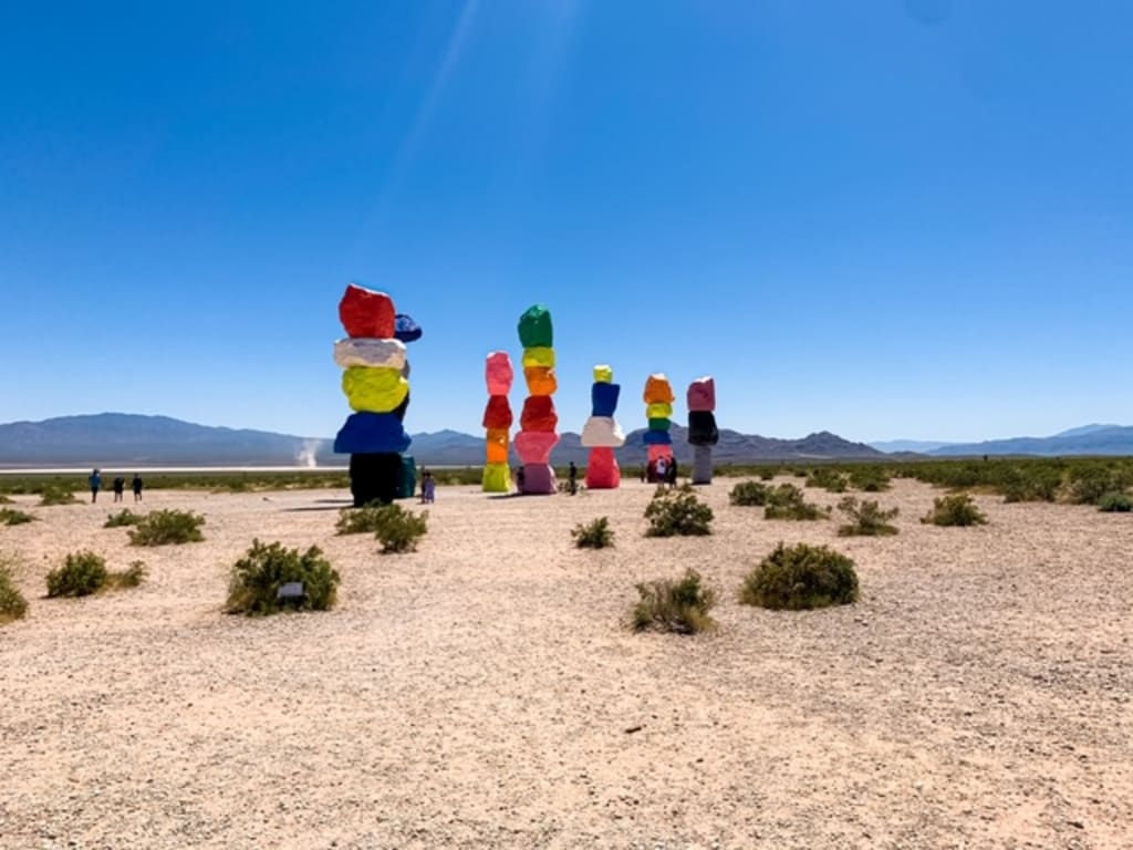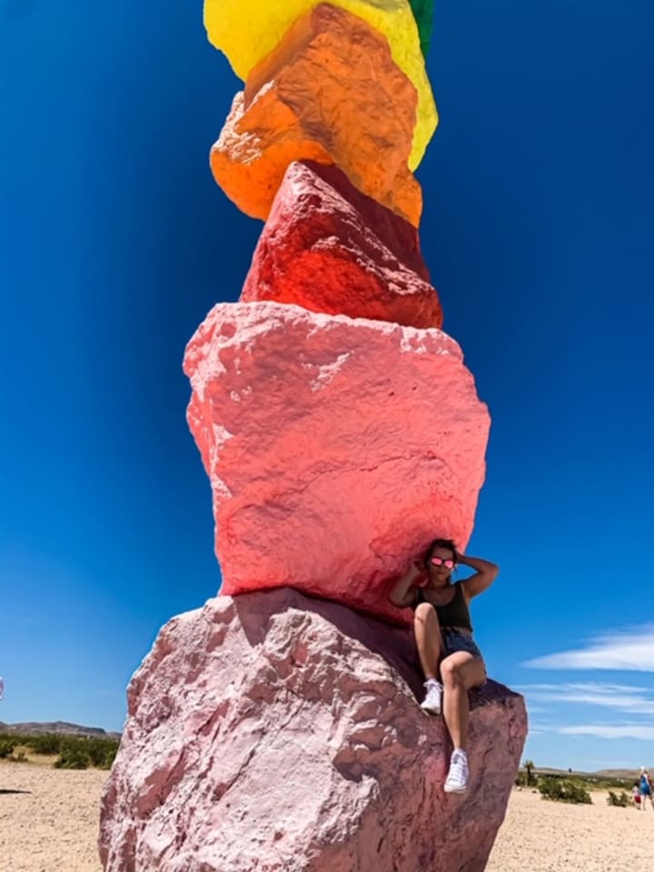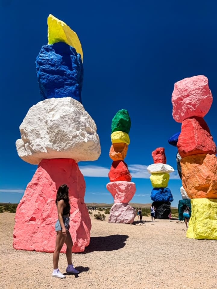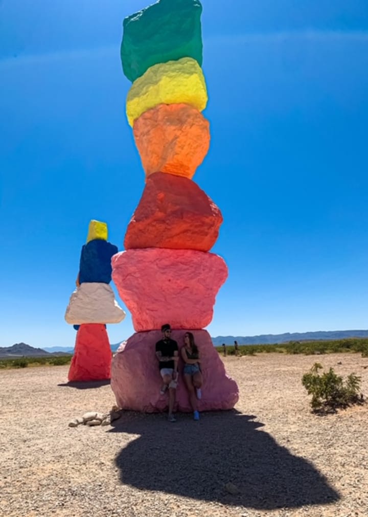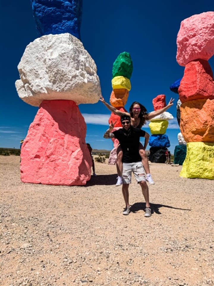 Being cooped up in my place because of COVID-19 restrictions had gotten me a bit stir crazy (me being a total extrovert). I am usually never home; I’m always either at the gym, out with friends or exploring the world. So, I looked up outdoor places to go that wasn't a National Park (they were all closed through the months of March, April and May). I wanted to go somewhere different than what I'm used to, and that's when I came across Seven Magic Mountains. I've been to Las Vegas so many times and never realized that there was a colorful art installation nearby! I told myself that next time I drive to Las Vegas I will commit to a quick stop at this magical place. Yea I was definitely kidding myself...not even a week later I woke up on a Saturday morning and decided I needed to get out of the state. My boyfriend, (who comes with me on almost all my travels) decided to join me on this long drive. Seven Magic Mountains here we come!