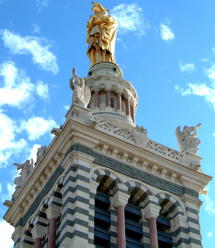 In a breathtaking hilltop location, the Basilique Notre-Dame de la Garde is the most important landmark in Marseilles. The site was used in ancient times as an observation point, and during the Middle Ages, was the location of a pilgrimage chapel.
