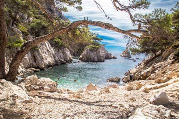 Parc National des Calanques is located between Marseilles and the fishing village of Cassis. Here the landscape is dominated by the Massif des Calanques Mountains. There are limestone rock walls with fjord-like coves filled with saltwater. Visitors enjoy outdoor activities like rock climbing, hiking, kayaking, and swimming. There are many trails to explore.