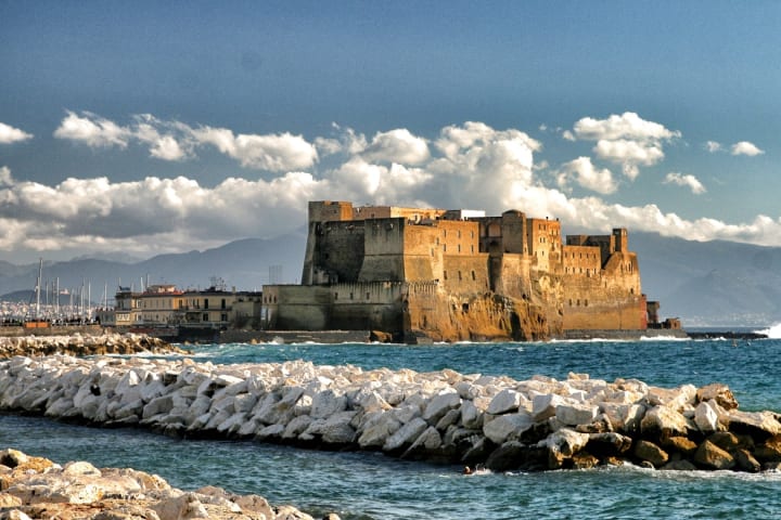 Castel dell'Ovo, the oldest castle in Naples, is located on a promontory at the end of Via Francesco Caracciolo. This 12th century fortress provides breathtaking panoramas of the harbor, ferries, bay, and Mt. Vesuvius. Additionally, the castle houses an Etho-Prehistory Museum showcasing ceramics and artifacts from ancient Naples.