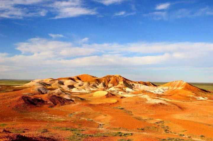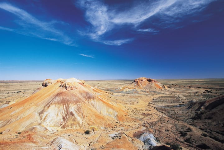 The Painted Desert is an ancient Inland Sea where all of the hills have been created by weather and erosion. Here you can see many amazing different colors in fantastic shades of orange, yellow, and white. Views here are particularly lovely at sunrise and sunset where the deep reds, browns, oranges, yellows, and whites blend together. Among all of the spectacular hills is the Mirackina Range, a long dark line of mesas running about 5 to 10 km to the west. The Painted Desert offers a fantastic hiking adventure with walks through the hills and marvelous natural wonders.