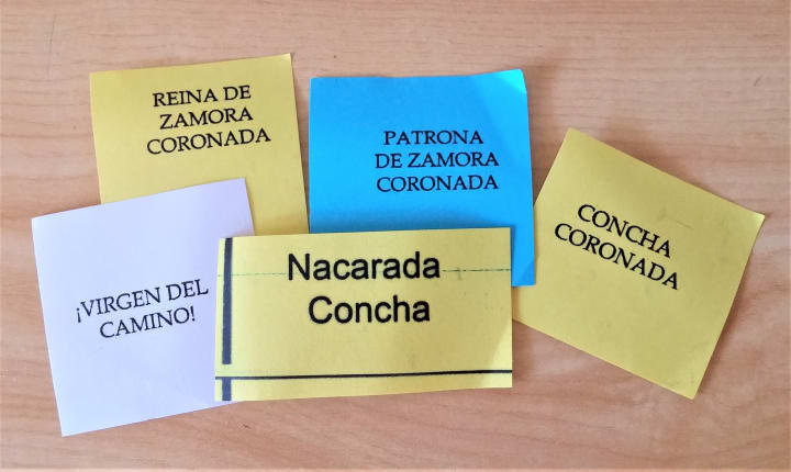 It had been cut with care from multicolored paper after being printed with all the Virgen's honorifics: Crowned Queen of Zamora, Crowned Patron of Zamora, Virgin of the Pilgrim's Way!, Mother-of-Pearl Shell, and Crowned Shell were the ones Fernando caught for me.
