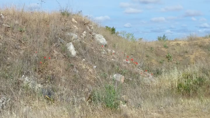 We were able to keep up a brisk pace, and the day was clear but not hot. The highway was closed to automobile traffic, which made for a lot of peace of mind. Red poppies lined the highway.