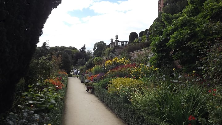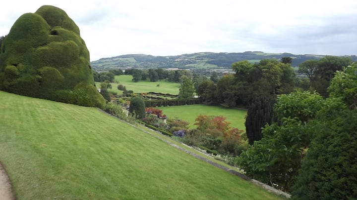 Castle is set on a rocky prominence above the valley in which Welshpool sits, which means that the slope below the castle would be far too steep to plant a garden unless the land was terraced, and that is precisely what has been done. Four broad terraces lead down from the castle to the valley floor, where the gardens continue.