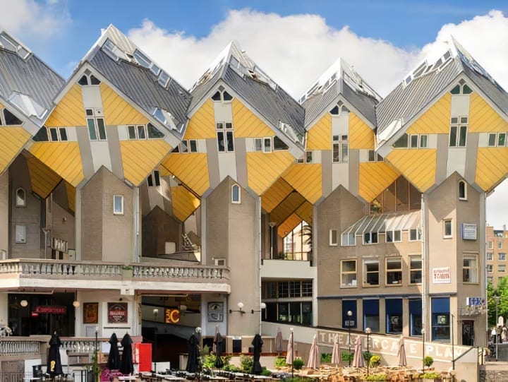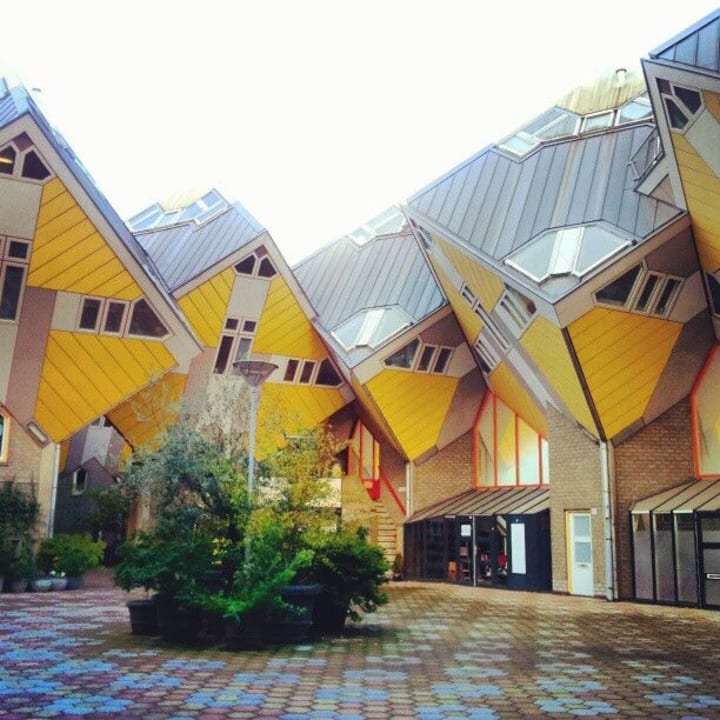 The Overblaak Development is a most fascinating apartment project. It was designed by Piet Blom and built from 1978 to 1984. It is located near the Blaak metro station and is known for its pencil-shaped tower and 45-degree-tilted, cube shaped apartments on hexagonal pylons.