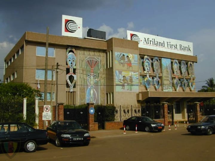 Afriland First Bank has colorful mosaics that depict tribal figures and Egyptian scenes. A metal gate has a mask motif.
