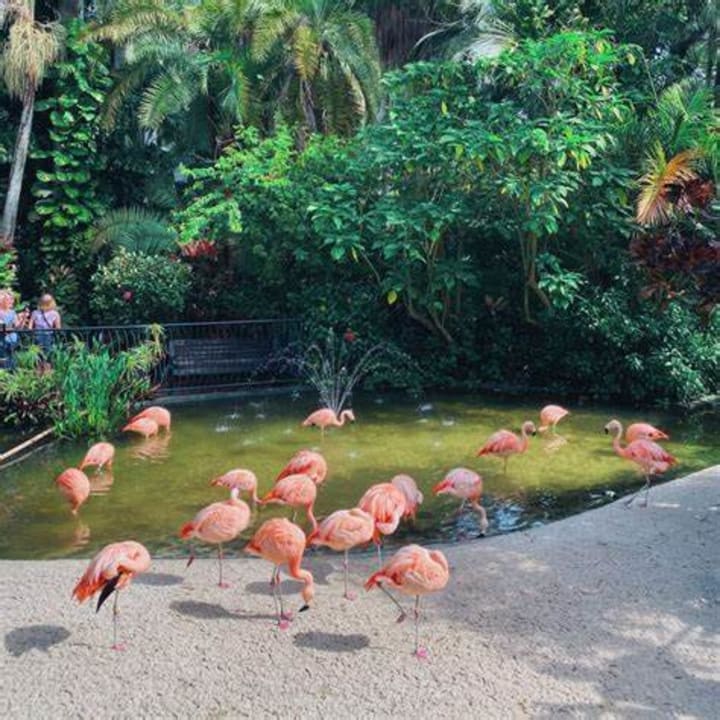 You’ll see tropical flora from all around the world. There’re are waterfalls, footbridges, and flamingos.