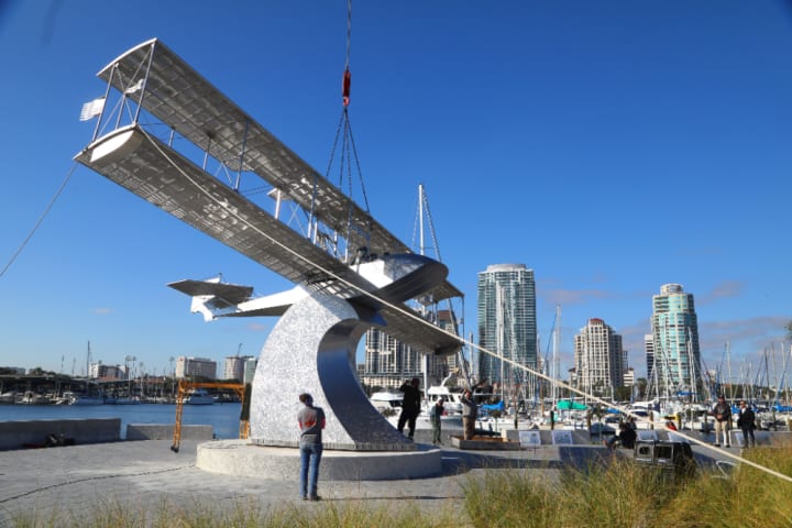 The sculpture the Benoist Airboat was first flown by Tony Jannus in 1914.