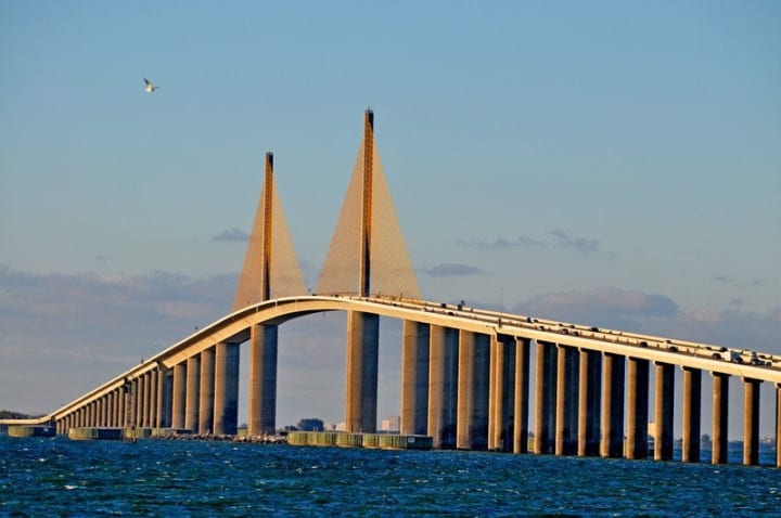 See the beautiful Sunshine Skyway Bridge which crosses the water at the entrance to Tampa Bay. The bridge stretches for twelve miles with over four miles of bridge rising above the ocean to let large vessels pass through. Two main pillars rising high above the road give the bridge a dramatic look.