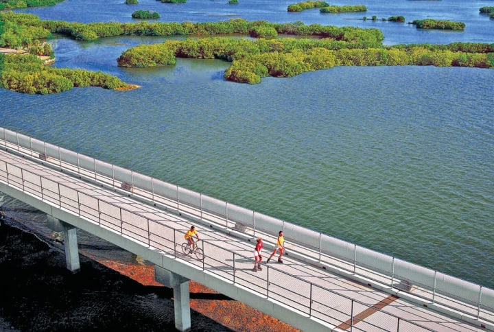 The Fred Marquis Pinellas Trail was created along an abandoned railroad corridor. This is a 37-mile-long park and recreation trail. It is enjoyed by walkers, runners, cyclists, and skaters. Along the way are shops, cafes, and restaurants. There are nine sculptures marking the various communities through which the trail passes.