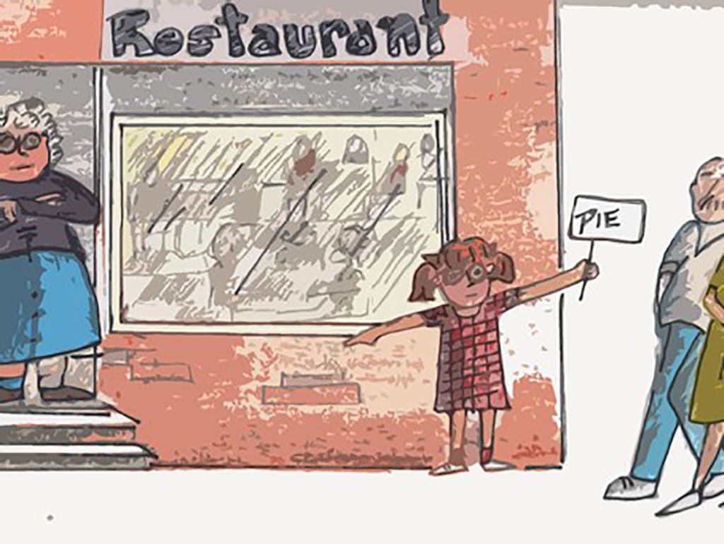 Maybe I’m just overly sensitive to the attitudes of tourists because I’ve spent pretty much my whole life living in a tourist town. I’ve seen the way they swoop in making demands and then leaving a wake of garbage and doggy poop bags for someone else to clean up. I once saw a woman watch her dog do his business on a sidewalk and then simply walk away. When I asked her if she was going to pick up after her pet she sneered, “No. I don’t pick up after coyotes either.” I wanted to point out the false logic here, but anyone who compares their dog to a wild animal isn’t going to be reasoned with. Where I live, full-time residents can’t even find a parking spot in the grocery store for the Wisconsin, New York, Quebec, and Michigan license plates. Don’t get me started on trying to get into the post office for mail. Our pretty, picturesque town is not the Magic Kingdom, though tourists frequently stop in the middle of the street to take pictures and then give you the finger if you honk. To be fair, some responsibility must be taken on the part of those who lure the tourist dollars. Like Doctor Frankensteins, they cater to every whim of the consumer creating little monsters who learn that some people will put up with anything for a buck. I speak from experience because I had a great-grandmother who was notorious. A keen entrepreneur, she would sink to any depth for a dollar. Her shameless exploits included using me to coax passersby into her restaurant. Propped up beside the front door in ponytails I was directed to repeat, “Fresh pie. Home-made pie,” for ten minutes any time sales were slow. At seven, it would prove to be my first acting job and I don’t mind adding, I was pretty good at it. My great-grandmother’s establishment was a plain, dated eatery with a velvet painting of ‘Dogs Playing Poker’ over the cash register. At seven, I thought it was a funny, tacky piece of art. My great-grandmother, treasured it. That’s the kind of place she ran. If someone didn’t like my great-grandmother’s pie and complained, she’d shrug her shoulders give them their bill and point them towards the door. “Good riddance!” she’d say, then turn to me, “Now go outside and see if you can drum up some more customers.”