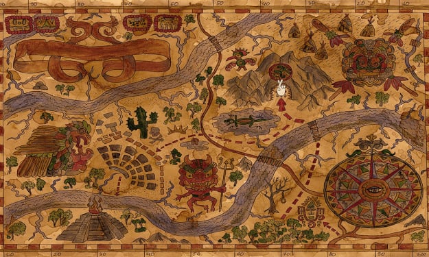 *A torn page with scattered water marks shoved between the cover and front page of a faded black journal* Chances are it's my skeleton smiling at you instead of me... Oh god... I hope it's my skeleton, please let me be a skeleton by the time you find me and not a halfway there, all bloated grossness... yuck. Forget that imagery please. Fortunately, there are so many little critters around I think they'll make quick work of me. I wonder if the venom in me will kill some of them. Does venom work on insects or worms or whatever? If I do get eaten and break down I am technically recycled which I'm all about so, I guess I like that better than the typical coffin situation. So, I am either dead or we are laughing over this wine in hand. Let’s see... What could save me right now? Chaac left for help right after I got bit, we are three days out from a town that maybe has a phone, so best case scenario he gets there and calls an emergency heli evac to find me in this dense jungle, needle meet haystack. What else... someone much more prepared than me who packed the correct antidotes for this region's venomous creatures happens by this secluded grotto, that would be nice. Orrr I internalize this venom and it makes me stronger like Poison Ivy from Batman! Please door number three! If I had to put odds on it, a thousand - a million? - to one I'm a goner. Goner is a funny word am I right? It's weird, I know I'm basically done for but somehow I'm in a peaceful place, just reflecting... could be the morphine I injected to numb the terrible burning pain coursing through my body but, here I am, calm as a cucumber staring up at the chef’s knife. Great idea alert, someone should sell this. Who needs a cocktail or a beer just take two parts venom, one part morphine and three parts dehydration bake in Mexican jungle sauna for a few days and voila! Don't get me wrong, this is definitely a bummer, I. Am. Bummed. A little more time on this big beautiful world, that would have been nice. I haven't even entered the "real world" and I'm already saying my goodbyes which is total BS. This trip was supposed to give me the greatest thesis ever and the doors of every curator and museum would fly open! They would pay me to travel the world exploring and looking for artifacts of past civilizations. Instead I go on my first trip and screw it all up. Anyway, sorry if my last words are weird, I'll make up for it right now, we found it! If you are traipsing around these parts then you probably know what I am talking about and I guess we didn’t “find it” find it, we found out where it definitely is which is just as good if you ask me. Well, at least it should be there. There is no way anyone found the guide post, the area was in total ruin, no one had been there in decades and it's the only thing that points to the final resting place of the artifact. Maybe it's the delirium or the venom eating my brain but I think it would be fun if you had to solve something instead of me just handing it to you on a silver platter. Yea, I had to work for it, and now you do too! Just, think about where you are the people and the heritage. OK, ready?