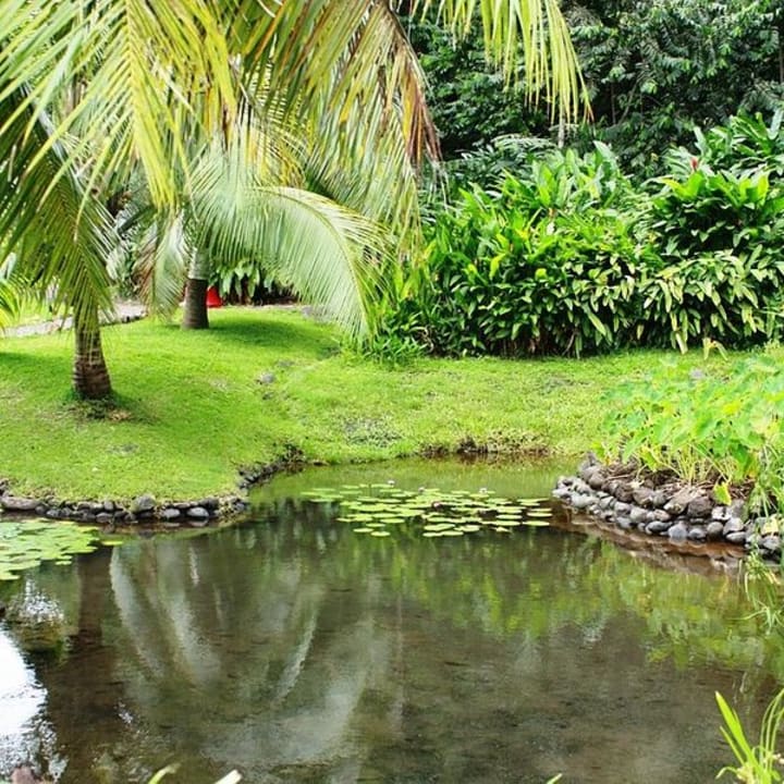Vaipahi Gardens are located on the southern coast of Tahiti Nui. Here you can find trails for hikers and many streams and springs. It is lovely to walk among tropical plants like the giant elephant-ear plants, pagoda trees, and the red flowers of a Pride of Burma. There are picnic areas with views over the lagoon.