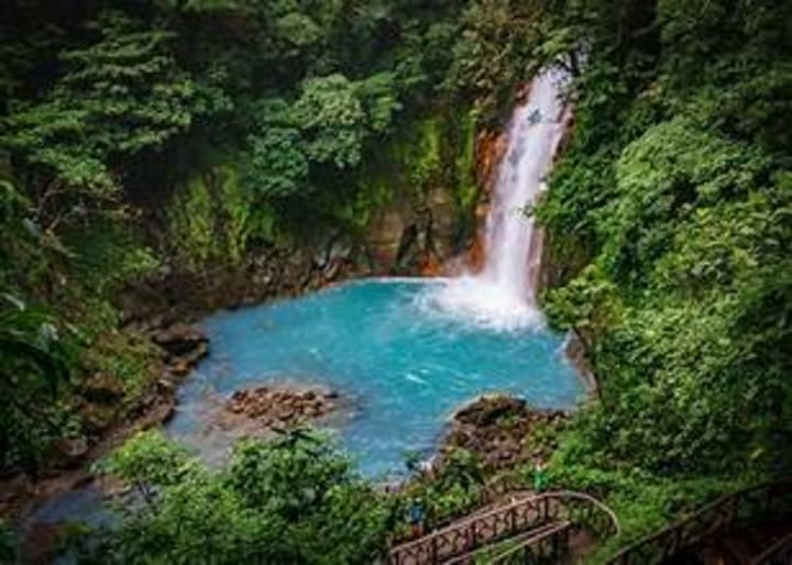 The Rio Celeste is located in Tenorio Volcano National Park and is among the most famous waterfalls in the country. The water spills over a cliff into a pool below. Legend has it that God painted the sky blue and afterward, cleaned his paintbrush in the river that feeds Rio Celeste. The hike takes hikers through lush rainforest with tropical birds in the trees above.