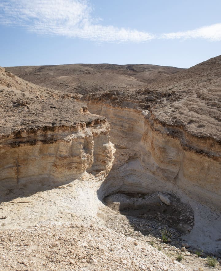 Set against the backdrop of Tunisia’s western desert, the cliffs feature layered bands of red, ochre, and chalky white rock, carved over centuries by seasonal rains and natural erosion. The layers of rock contrast with palm trees growing beside the barren terrain, which gives the place a distinctly Tunisian character.