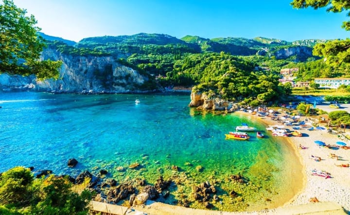 On the island of Corfu, the most popular beach area is Paleokastritsa on the west coast. There are curving bays, sand, and pebble beaches that stretch into the sparkling blue sea.