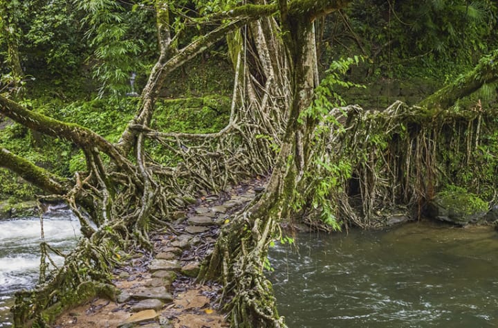 In the northeastern state of Meghalaya, a mesmerizing natural phenomenon awaits living bridges. The indigenous Khasi people have ingeniously grown bridges made of living tree roots over centuries. These remarkable structures, formed by guiding the roots of rubber trees, are not only functional but also stunning to behold. Trekking through the dense rainforests and crossing these living bridges is a truly offbeat experience that will leave you in awe of nature's ingenuity.