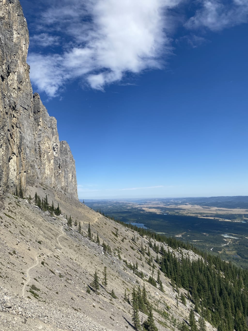 The path in front of me disappeared amongst the bedrock. Now what? What lay ahead of me was a steep mound of loose gravel and scree that I had to cross in order to make it off this mountain safely. On my right, down below, I could see trees that looked so small it once again reminded me how elevated I was. From what I remember before attempting this hike, Mount Yamnuska was about 2,300 metres tall. The descent from the top was scary enough as it was, and now this feeling of pure fear was bubbling back up again. I was alone, with no hiking equipment, and nothing more than my backpack, fanny pack and nearly empty water bottle. Phone was sitting at 10% battery life with no reception, the sun was approaching the horizon, and I still had to make it back down to my car.